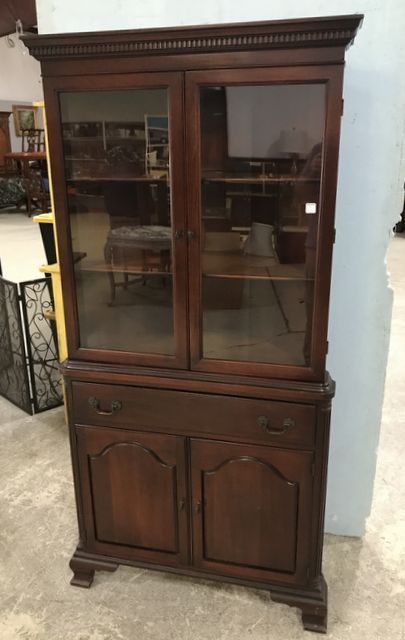 Duncan Phyfe Mahogany Corner Cabinet, two wood shelves, single drawer, double doors, light wear, good condition, 70"h., 34"w., 16"d. Duncan Phyfe Mahogany Corner Cabinet, two wood shelves, single drawer, double doors, light wear, good condition, 70"h., 34"w., 16"d.