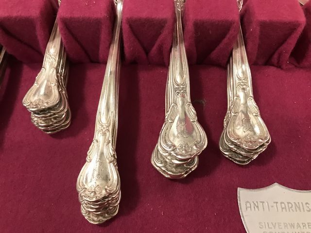 Gorham "Chantilly" Sterling Flatware, 6 salad forks, 5 dinner forks, 7 place spoons, 6 iced tea spoons, 3 serving spoons, 6 soup spoons, 5 butter knives, 6 dinner knives, 44 total pieces, 43.465 ozt (knives not included in weight). Does have monograms. Gorham "Chantilly" Sterling Flatware, 6 salad forks, 5 dinner forks, 7 place spoons, 6 iced tea spoons, 3 serving spoons, 6 soup spoons, 5 butter knives, 6 dinner knives, 44 total pieces, 43.465 ozt (knives not included in weight). Does have monograms.