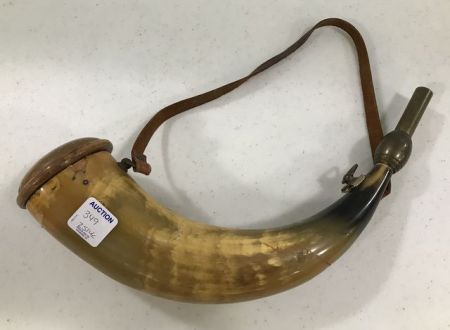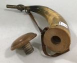 Vintage Black Powder Horn, brass push button, wood screw cap, with leather strap 13". Vintage Black Powder Horn, brass push button, wood screw cap, with leather strap 13".