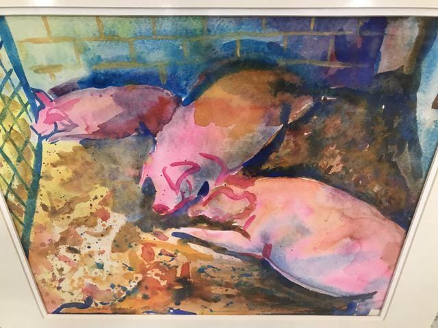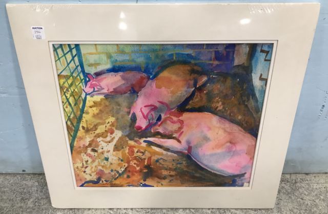 Emelie Hebert Watercolor of Pigs, matted, no frame, signed lower left, 20"h., 23"w. Emelie Hebert is an award-winning, classically trained fine artist, vibrant watercolors, skilled jewelry designer and fabricator, native of Baton Rouge, LA, who currently resides in Madison, MS. Emelie Hebert Watercolor of Pigs, matted, no frame, signed lower left, 20"h., 23"w. Emelie Hebert is an award-winning, classically trained fine artist, vibrant watercolors, skilled jewelry designer and fabricator, native of Baton Rouge, LA, who currently resides in Madison, MS.