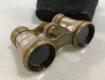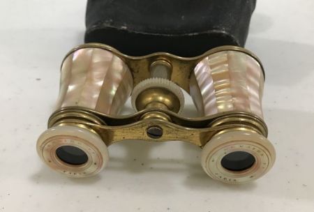 Lemaire Paris Opera Binoculars, brass with mother of pearl design, with leather case, 3 1/2". Lemaire Paris Opera Binoculars, brass with mother of pearl design, with leather case, 3 1/2".
