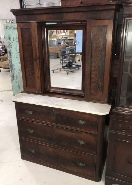 Antique Burl Mahogany dresser, marble top, center mirror with side pedestal storage with single doors, shelves, removable top, three drawers, average condition considering age, 71"h., 44"w. 18"d. Antique Burl Mahogany dresser, marble top, center mirror with side pedestal storage with single doors, shelves, removable top, three drawers, average condition considering age, 71"h., 44"w. 18"d.