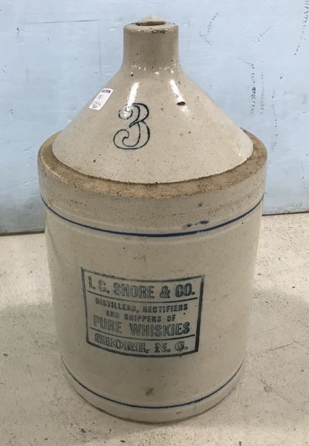 I.C. Shore & Co. Pure Whiskies Shore, N.C. Number 3, stoneware jug, has some minor age wear, 17"h. I.C. Shore & Co. Pure Whiskies Shore, N.C. Number 3, stoneware jug, has some minor age wear, 17"h.