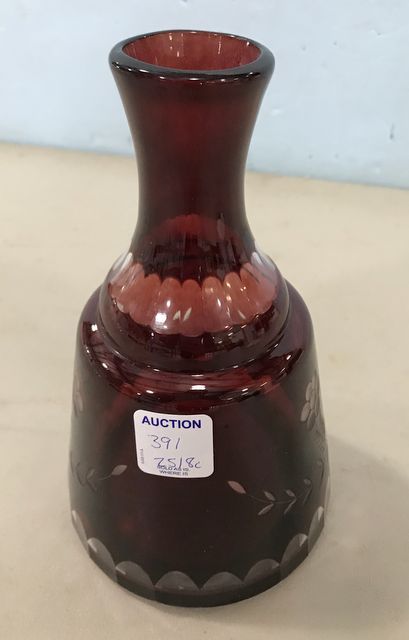 Bohemian Red Cut to Clear Vase, flower designs, 8"h. Bohemian Red Cut to Clear Vase, flower designs, 8"h.