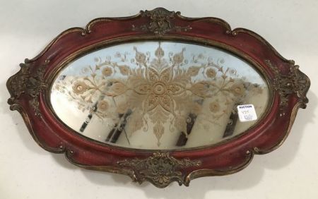 New Dresser mirror stand, antique style red frame, etched floral designs, 18"w. New Dresser mirror stand, antique style red frame, etched floral designs, 18"w.