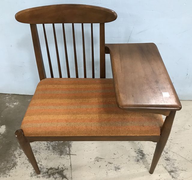 Tell City Danish Walnut Telephone Bench, upholstered bench seat, spindle back, good condition, 32"h., 28"w. Tell City Danish Walnut Telephone Bench, upholstered bench seat, spindle back, good condition, 32"h., 28"w.