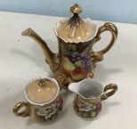 Lefton porcelain tea set, Japanese, hand painted with gold gilt, pitcher 8"h., sugar, creamer. Lefton porcelain tea set, Japanese, hand painted with gold gilt, pitcher 8"h., sugar, creamer.