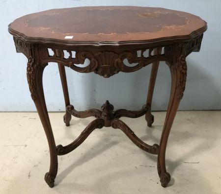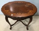 Early 1900's French Style Cocktail Table walnut, inlaid floral design top, hand cared base, several ring marks on top, 29"h., 31"w., 22"d. Early 1900's French Style Cocktail Table walnut, inlaid floral design top, hand cared base, several ring marks on top, 29"h., 31"w., 22"d.