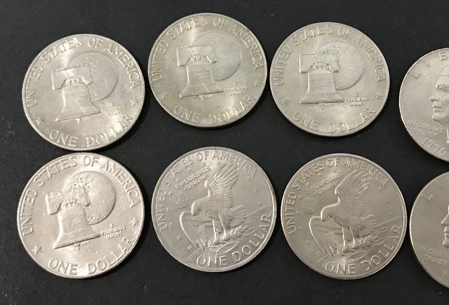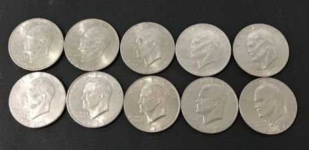 Ten Liberty Eisenhower One Dollar coins, 6 are 1976, 2 are 1971, 1972, 1974. Ten Liberty Eisenhower One Dollar coins, 6 are 1976, 2 are 1971, 1972, 1974.