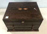 Vintage Mahogany Flatware Box, inlaid design top, two drawers, lift top with wood dividers, no key, 9"h., 15"w., 11"d. Vintage Mahogany Flatware Box, inlaid design top, two drawers, lift top with wood dividers, no key, 9"h., 15"w., 11"d.