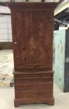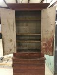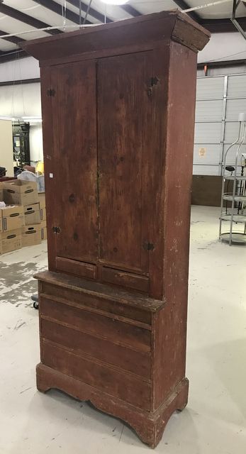 Antique Primitive Storage Cabinet, painted red, distressed, double door, four drawers, needs pulls, age wear, 89"h., 36"w., 19"d. Antique Primitive Storage Cabinet, painted red, distressed, double door, four drawers, needs pulls, age wear, 89"h., 36"w., 19"d.