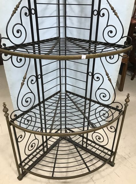 Heavy Duty Wrought Iron Corner Baker's Rack/Display, brass and black, sturdy, 88"h., 37"w., 27"d. Heavy Duty Wrought Iron Corner Baker's Rack/Display, brass and black, sturdy, 88"h., 37"w., 27"d.