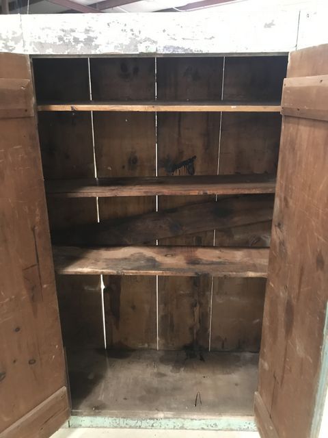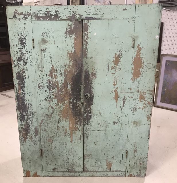Antique Primitive Two Door Green Cabinet, three shelves, distressed, 70"h., 54"w., 19"d. Antique Primitive Two Door Green Cabinet, three shelves, distressed, 70"h., 54"w., 19"d.