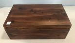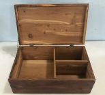 Hand made pine storage box, lift top with divided inner sections, has some age wear, 7"h., 18"w. Hand made pine storage box, lift top with divided inner sections, has some age wear, 7"h., 18"w.