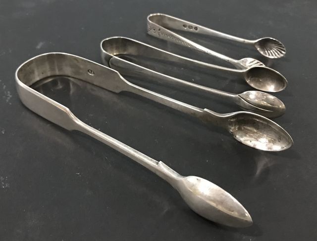 Three Pairs of British Sterling Sugar Tongs, London 1884 4 1/4" long, London 1890 Engraved 3 1/2" long, London 1867 5 1/2" long RS maker, 2.730 ozt. Three Pairs of British Sterling Sugar Tongs, London 1884 4 1/4" long, London 1890 Engraved 3 1/2" long, London 1867 5 1/2" long RS maker, 2.730 ozt.