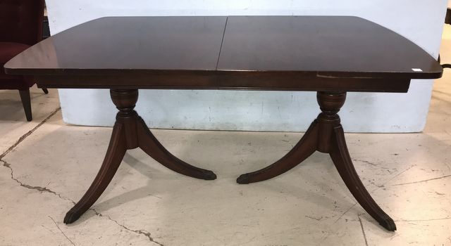 Vintage Double Pedestal Mahogany Dining Table, brass claw footed, has some finish scratches, single 18" x 42" leaf, table is 30"h., 62"long., 42"w. Vintage Double Pedestal Mahogany Dining Table, brass claw footed, has some finish scratches, single 18" x 42" leaf, table is 30"h., 62"long., 42"w.