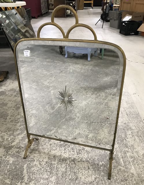 Vintage Beveled Mirror Fireplace Screen, gold painted metal frame, etched center medallion, silvered mirror, bottom is pealing, 31"h., 19"w. Vintage Beveled Mirror Fireplace Screen, gold painted metal frame, etched center medallion, silvered mirror, bottom is pealing, 31"h., 19"w.