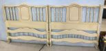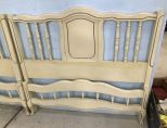 Pair of Henry Link French Provincial Twin Beds, antique factory painted white with gold trim, has metal rails, good condition. Pair of Henry Link French Provincial Twin Beds, antique factory painted white with gold trim, has metal rails, good condition.
