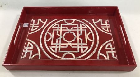Modern Red Oriental Serving Tray, mother of pearl inlay, 20" x 13". Modern Red Oriental Serving Tray, mother of pearl inlay, 20" x 13".
