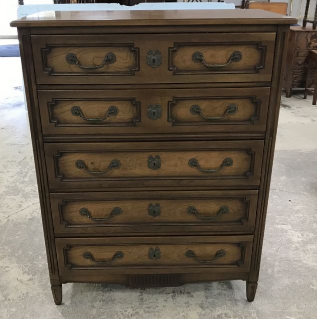 French Provincial Chest of Drawers, five drawers, walnut, average condition, 51"h., 39"w., 19"d. French Provincial Chest of Drawers, five drawers, walnut, average condition, 51"h., 39"w., 19"d.