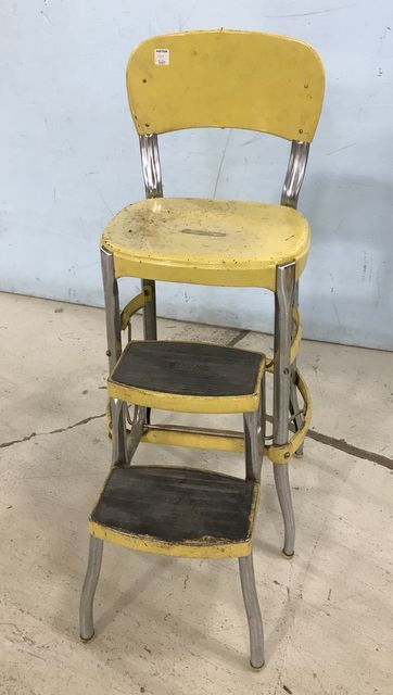 1950's Vintage Cosco Step Ladder Chair, yellow painted metal, age distressed, two step, 35"h. 1950's Vintage Cosco Step Ladder Chair, yellow painted metal, age distressed, two step, 35"h.