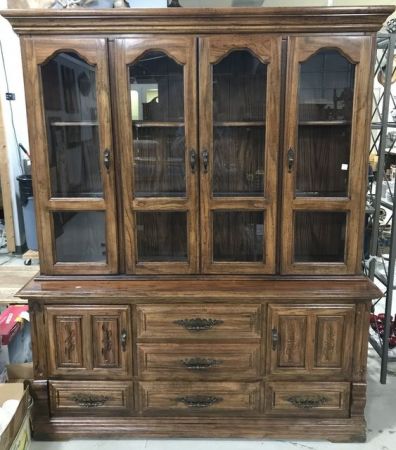 Late 20th Century Oak China Cabinet, two piece, glass shelves, light wear, base has doors and drawers, 80"h., 66"w., 19"d. Late 20th Century Oak China Cabinet, two piece, glass shelves, light wear, base has doors and drawers, 80"h., 66"w., 19"d.