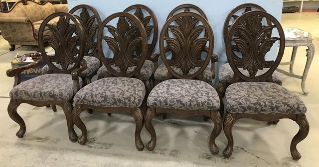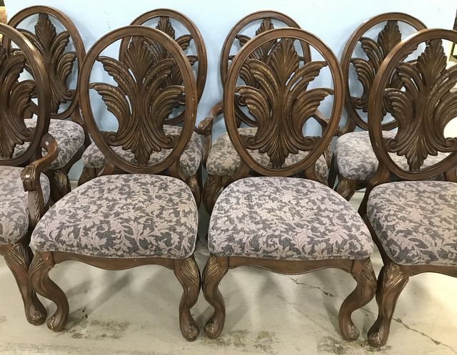 Eight French style dining chairs, cherry, two arms, 8 sides, floral fabric seats, has usage wear, large chairs, 43"h. Eight French style dining chairs, cherry, two arms, 8 sides, floral fabric seats, has usage wear, large chairs, 43"h.