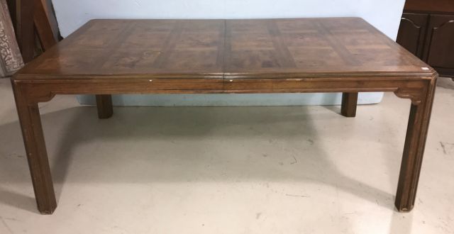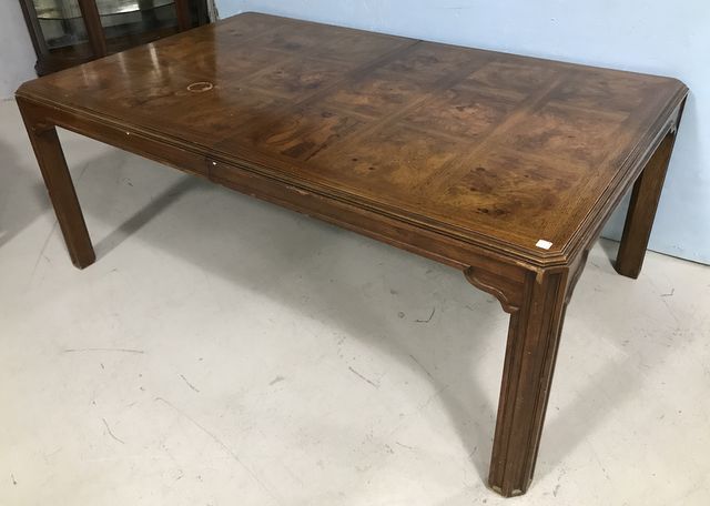 Sketchbook by Heritage Burl Walnut Parquetry Dining Room, 29"h., 75"long., 46"w, piece has worn areas on finish, also ring mark on top, three leaves, one leaf a moisture damage, 22"w. Sketchbook by Heritage Burl Walnut Parquetry Dining Room, 29"h., 75"long., 46"w, piece has worn areas on finish, also ring mark on top, three leaves, one leaf a moisture damage, 22"w.