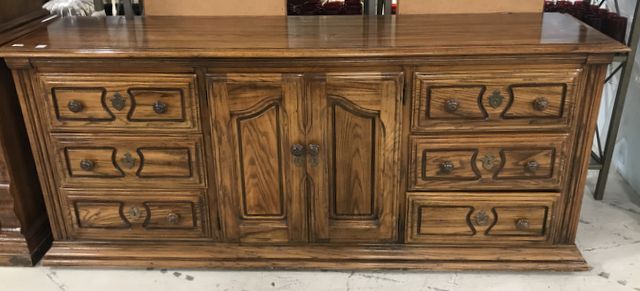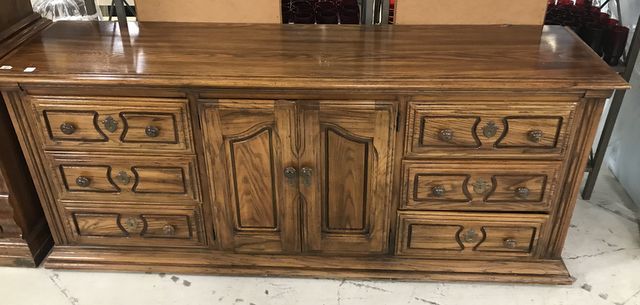 Late 20th Century Oak Triple Dresser, 6 drawers, center doors, included to back mirrors, light wear, 30"h., 72"long., 18"d. Late 20th Century Oak Triple Dresser, 6 drawers, center doors, included to back mirrors, light wear, 30"h., 72"long., 18"d.