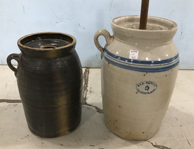 WID Suggs Number 5, Smithville, Mississippi, with wood churn, 17"h., brown butter churn. WID Suggs Number 5, Smithville, Mississippi, with wood churn, 17"h., brown butter churn.