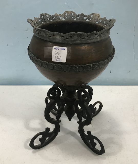 Decorative metal center piece urn, ornate metal base, with vase, 11"h. Decorative metal center piece urn, ornate metal base, with vase, 11"h.