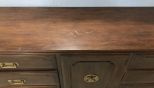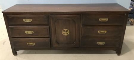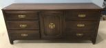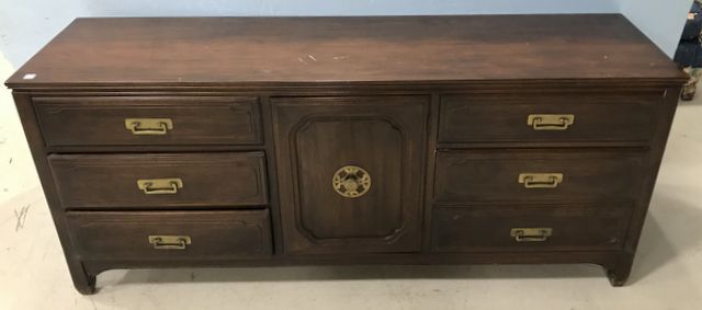 Davis Furniture Company Asian Style Dresser, cherry finish, 6 drawers with center door, has several scratches and swirls, 31"h., 72"w., 20"d. Davis Furniture Company Asian Style Dresser, cherry finish, 6 drawers with center door, has several scratches and swirls, 31"h., 72"w., 20"d.