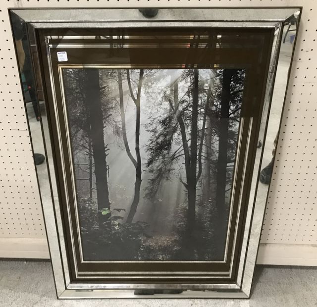 Mirror Framed Morning Light In Woods, frame is mirrored, 40"h., 28"w. Mirror Framed Morning Light In Woods, frame is mirrored, 40"h., 28"w.