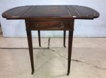 Fine Furniture Gordon's Leather Drop Leaf Side Table, spring lock sides, on casters, single drawer, light wear, 27"h., 25"w., 39"w. Fine Furniture Gordon's Leather Drop Leaf Side Table, spring lock sides, on casters, single drawer, light wear, 27"h., 25"w., 39"w.