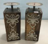 Pair of decorative wood candle stands, metal decor, 11"h. Pair of decorative wood candle stands, metal decor, 11"h.