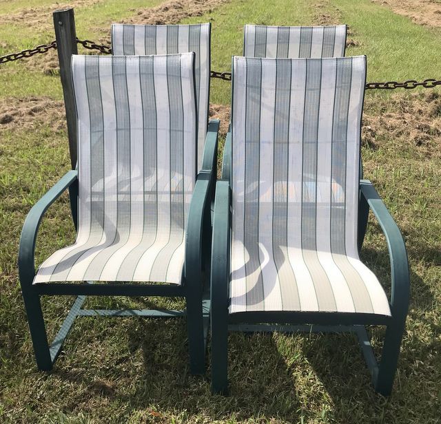 Four Metal Outdoor Patio Chairs, nylon seats, good condition. Four Metal Outdoor Patio Chairs, nylon seats, good condition.