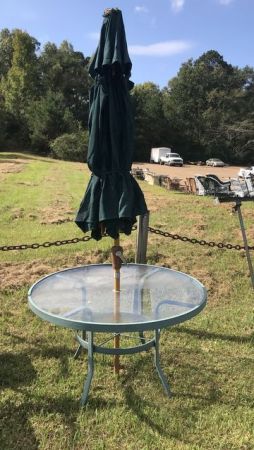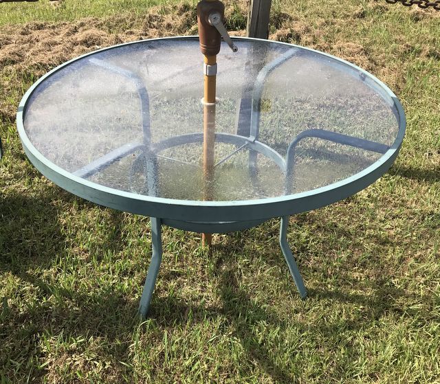 Round metal outdoor patio table, glass top, included umbrella. Round metal outdoor patio table, glass top, included umbrella.