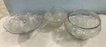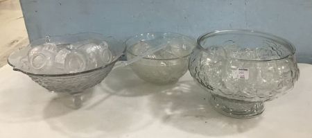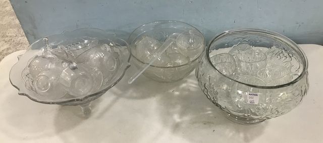 686 Three Clear Glass Punch Bowls and Cups