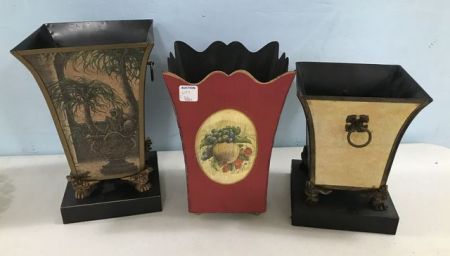 Three Modern Tin Decorative Planters, good condition, 11 1/2"h. Three Modern Tin Decorative Planters, good condition, 11 1/2"h.