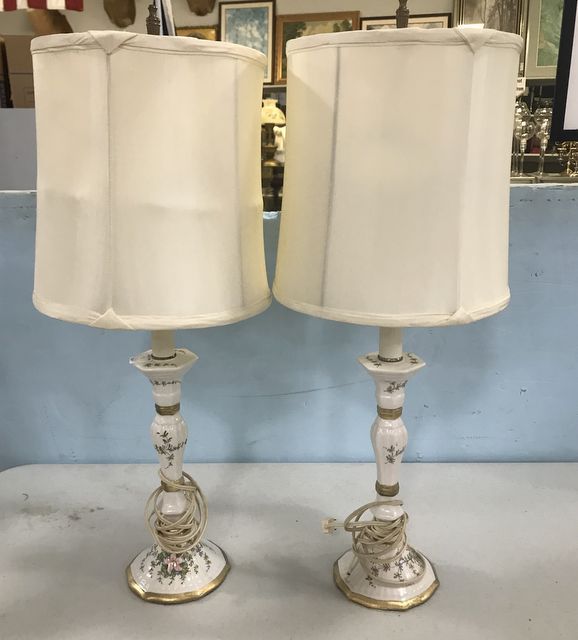 Pair of Hand Painted Porcelain Candle Stick Lamps, floral designs, with shades, one has hair crack at base, 26"h. Pair of Hand Painted Porcelain Candle Stick Lamps, floral designs, with shades, one has hair crack at base, 26"h.