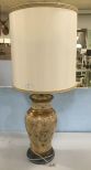 Large French Style Painted Ceramic Vase Lamp, gold gilt, brass base, with shade, 39"h. Large French Style Painted Ceramic Vase Lamp, gold gilt, brass base, with shade, 39"h.
