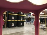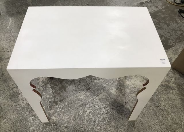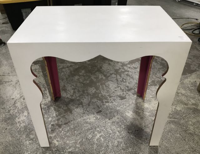 White Painted side table with border gold trim and hot pink underneath, 24"h., 26"w., 16"d. White Painted side table with border gold trim and hot pink underneath, 24"h., 26"w., 16"d.