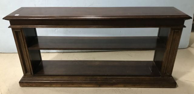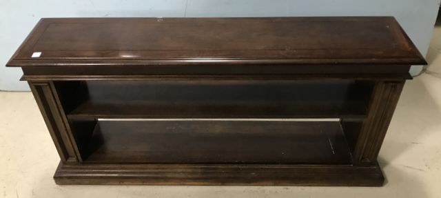 Modern Cherry short bookcase, one shelf, needs cleaning, has finish wear, 26"h., 54"w., 12"d. Modern Cherry short bookcase, one shelf, needs cleaning, has finish wear, 26"h., 54"w., 12"d.