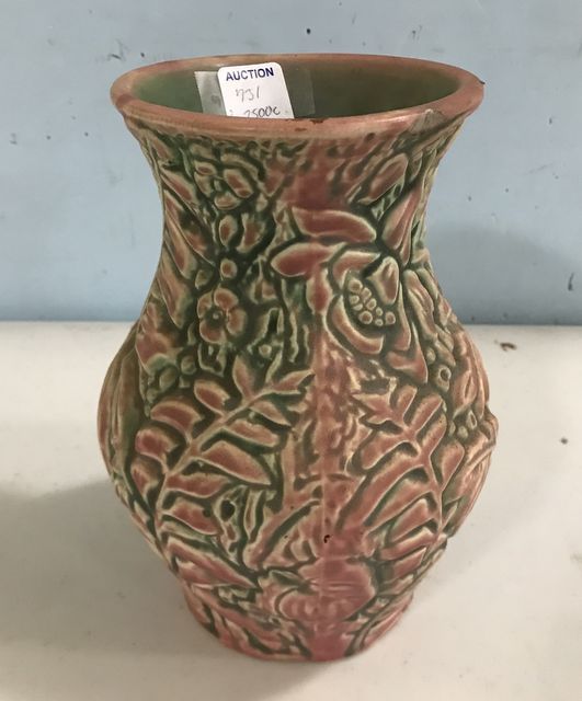 Weller Floral Pottery Vase, embossed style, has small chip on rim, 8"h. Weller Floral Pottery Vase, embossed style, has small chip on rim, 8"h.