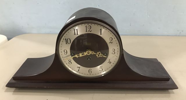 Vintage Elgin Mahogany Mantle Clock, glass face, 9"h., 18"w. Vintage Elgin Mahogany Mantle Clock, glass face, 9"h., 18"w.