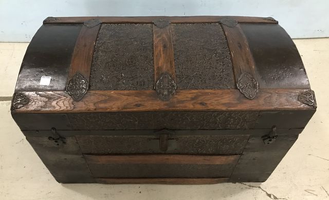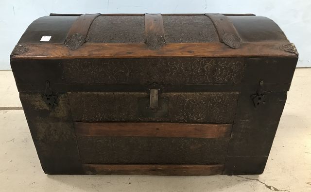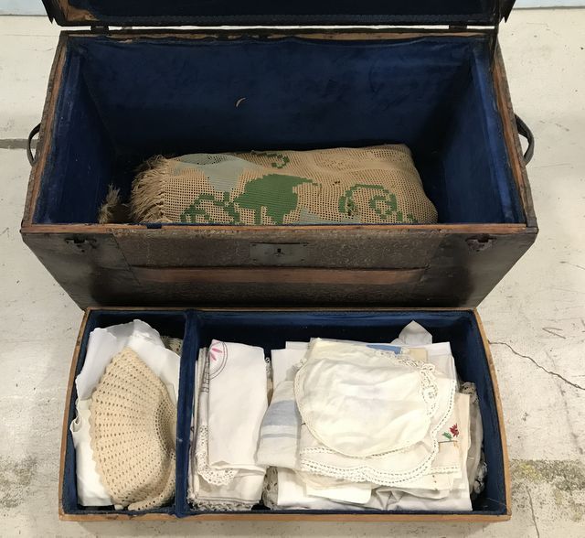 Nice antique streamer trunk, metal and wood frame, handles, inner tray, felt lining, includes napkins and quilt, 19"h., 30"w. Nice antique streamer trunk, metal and wood frame, handles, inner tray, felt lining, includes napkins and quilt, 19"h., 30"w.