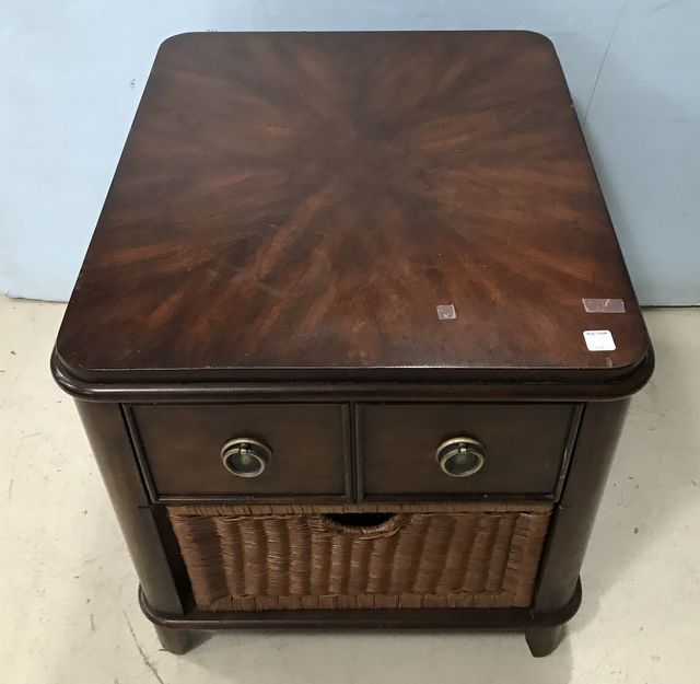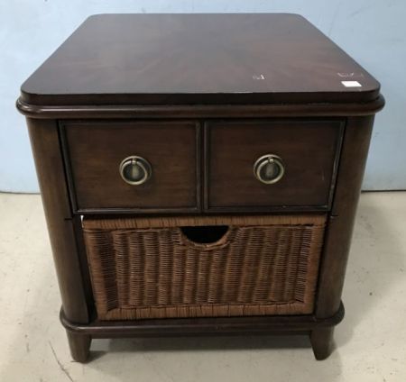 Modern Cherry side table, two drawers, with storage woven baskets, has finish wear, 23"h., 22"w., 27"d. Modern Cherry side table, two drawers, with storage woven baskets, has finish wear, 23"h., 22"w., 27"d.