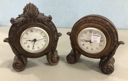 Two Wood Resin Design Clocks, battery operated, 9"h. Two Wood Resin Design Clocks, battery operated, 9"h.