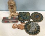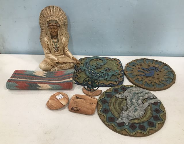 Native America Art work and Chief Statue 13"h, wall plaques, sand stones, rug, emblem. Native America Art work and Chief Statue 13"h, wall plaques, sand stones, rug, emblem.