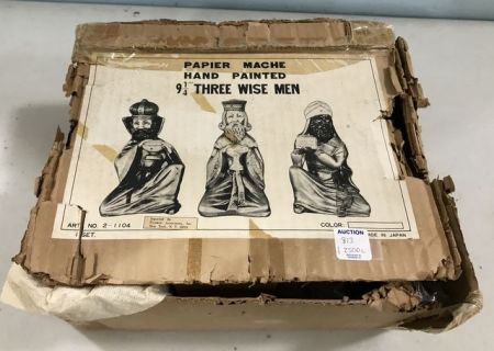 Papier Mache Hand Painted Three Wise Men, 9 1/4"h., in original boxes. Papier Mache Hand Painted Three Wise Men, 9 1/4"h., in original boxes.